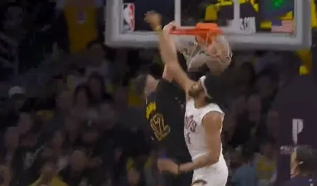 比赛第二节,拉拉维亚强硬杀入禁区,面对阿伦送上单臂隔扣。